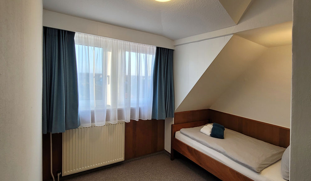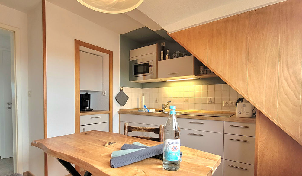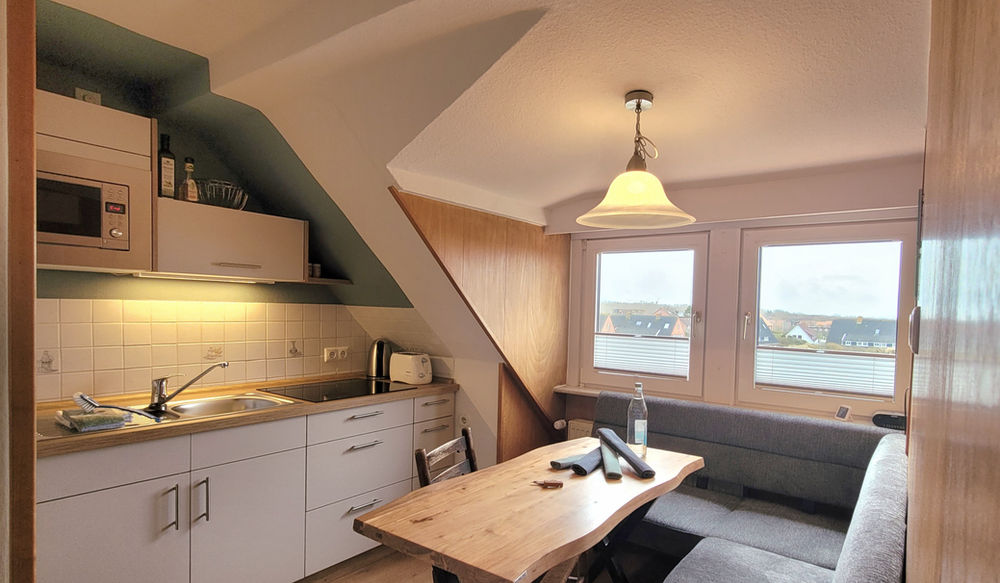 Unser gemütliches Appartement 3 liegt im Dachgeschoss und bietet auf 44m² Platz für bis zu 4 Personen. Es verfügt über zwei Einzel-Schlafzimmer und einen Wohn- und Schlafraum mit bequemer 1,60cm breiter Schlafcouch. Die neue, gemütliche Küche mit Eckbank, Ceranfeld, Mikrowelle mit Grillfunktion und Kaffeemaschinen ist gut ausgestattet. Das Badezimmer verfügt über Dusche und WC. Vom Wohnzimmer und dem kleinen Balkon aus genießen Sie einen herrlichen freien Blick über die Dünenlandschaft, von den bunten Buden zum Wasserturm bis hin zum Meer - mit fantastischen Sonnenuntergängen.